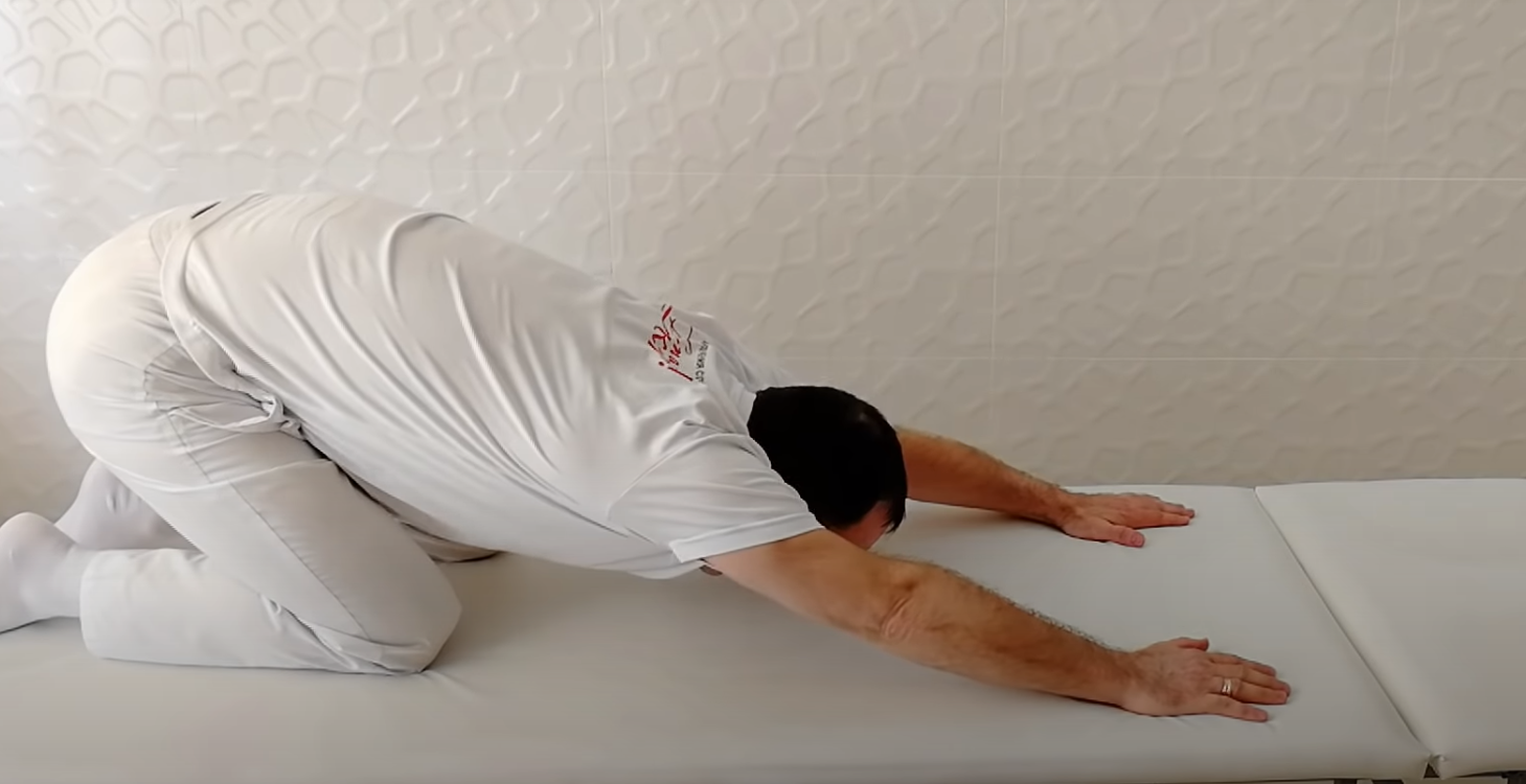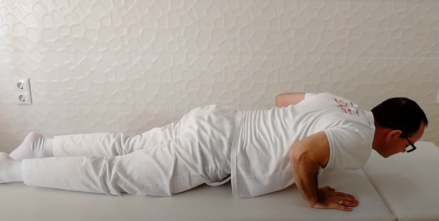 Należy położyć się na brzuchu z rękami przy klatce piersiowej. Przesuwaj dłonie po macie, ale nie zdejmuj ich. Następnie należy docisnąć pośladki do pięt.