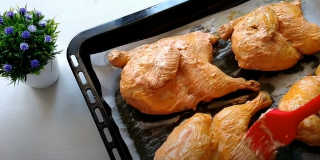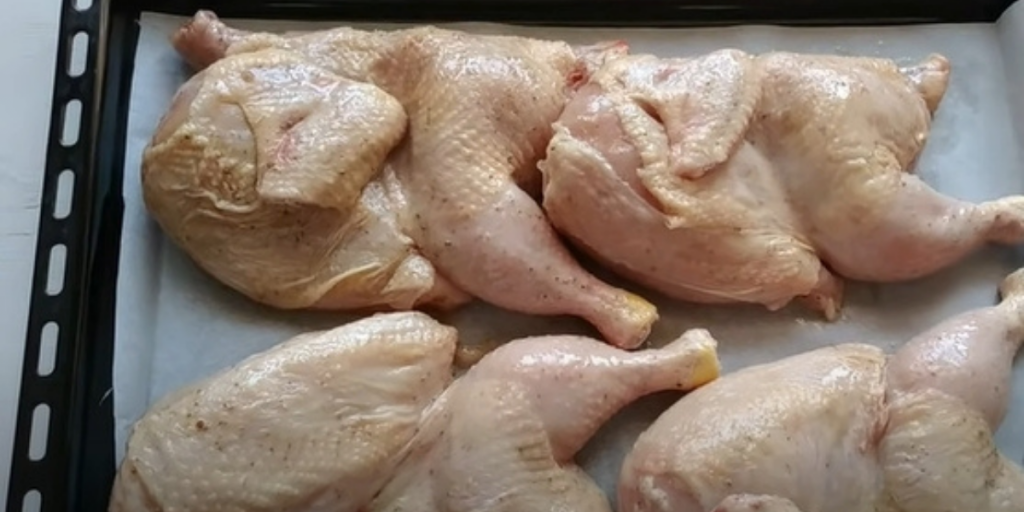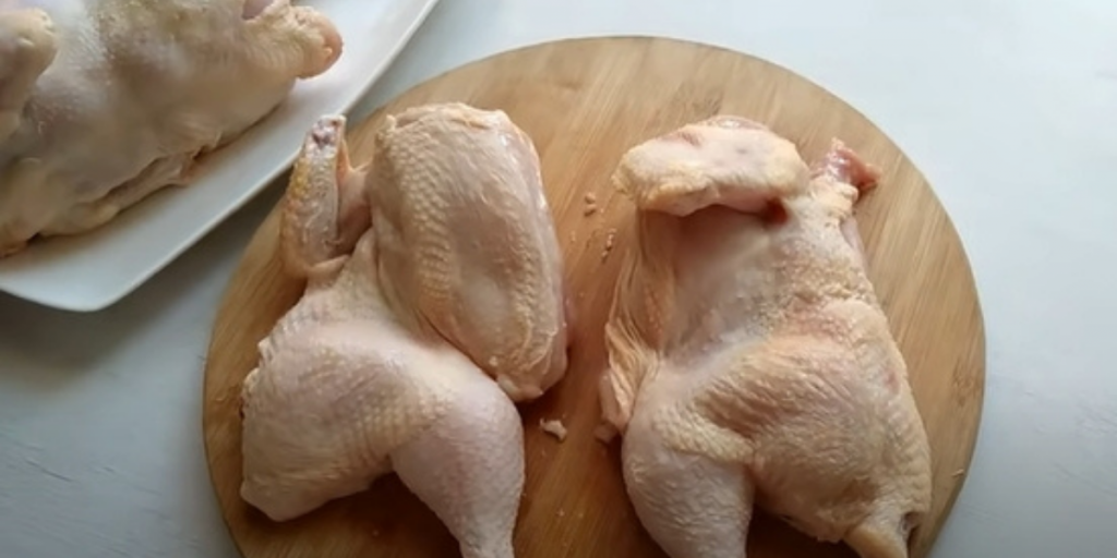 Kurczaka dokładnie obmyj pod zimną, bieżącą wodą. Usuń pozostałości piór i przekrój go wzdłuż na dwie połowy.