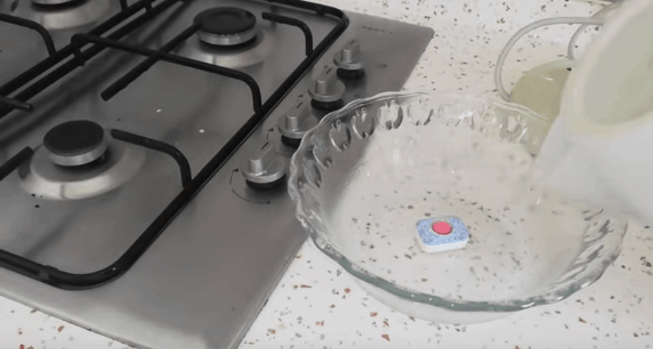 Do tego procesu potrzebne są tylko trzy rzeczy: tabletka do zmywarki, gorąca woda, oraz gąbka lub ręcznik papierowy/szmatka.