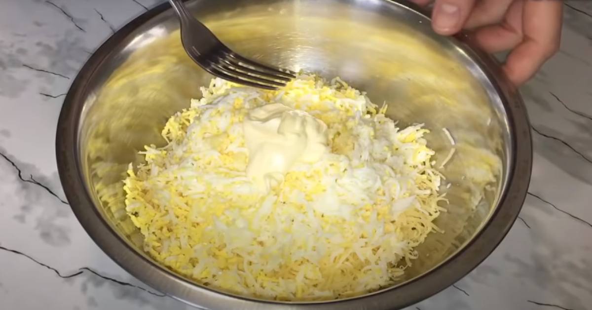 Ugotuj jajka na twardo, ostudź i zetrzyj wraz z serem na drobnej tarce. Dopraw solą. Przeciśnij przez praskę czosnek i dodaj majonez. Dobrze wymieszaj.