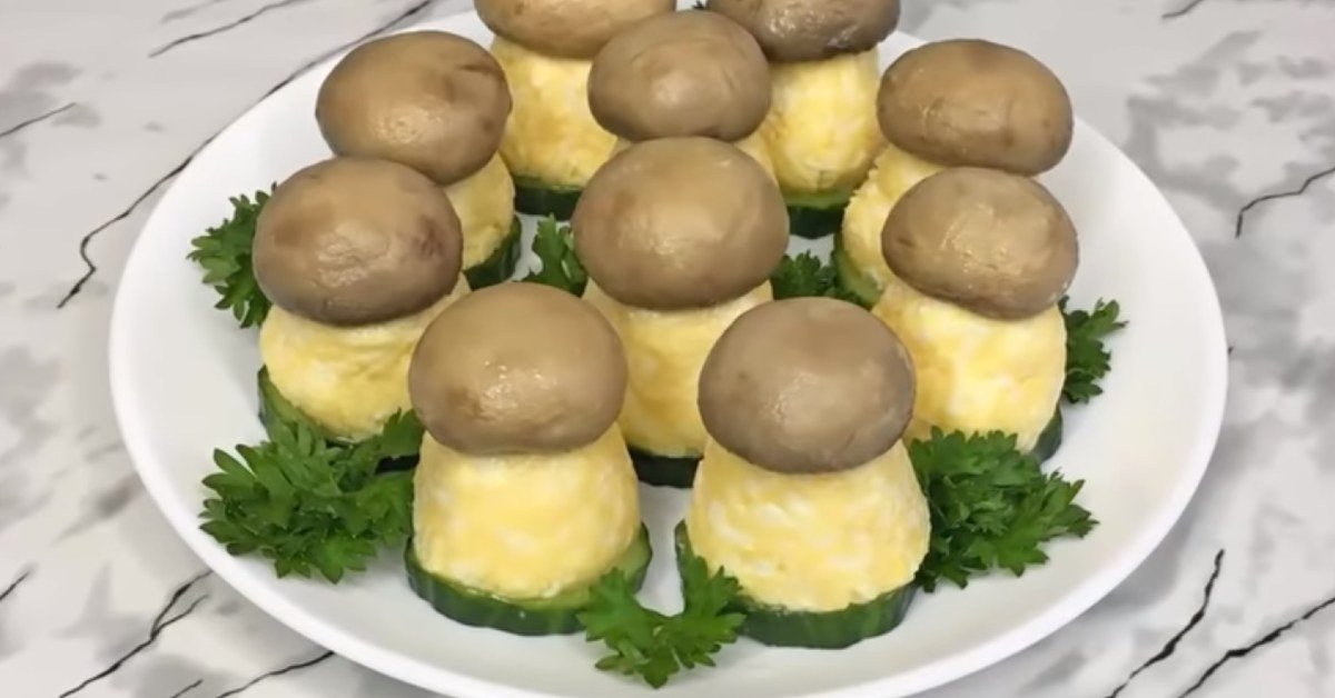 Weź łyżkę masy jajeczno-serowej i zwiń w kulkę. Następnie uformuj ją w podłużny kształt, tworząc łodygę przyszłego „grzyba” i połóż ją na kawałku ogórka.