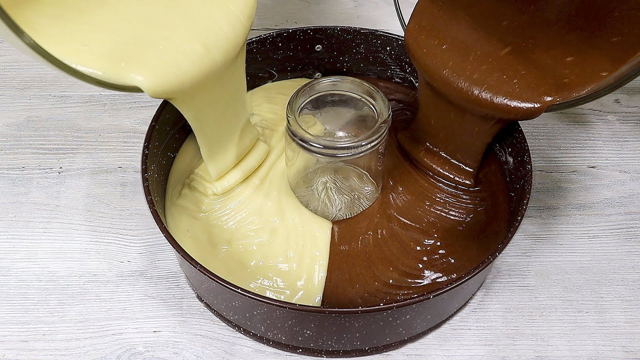 Na środku formy ustaw szklankę i wlej jednocześnie obie części ciasta.
