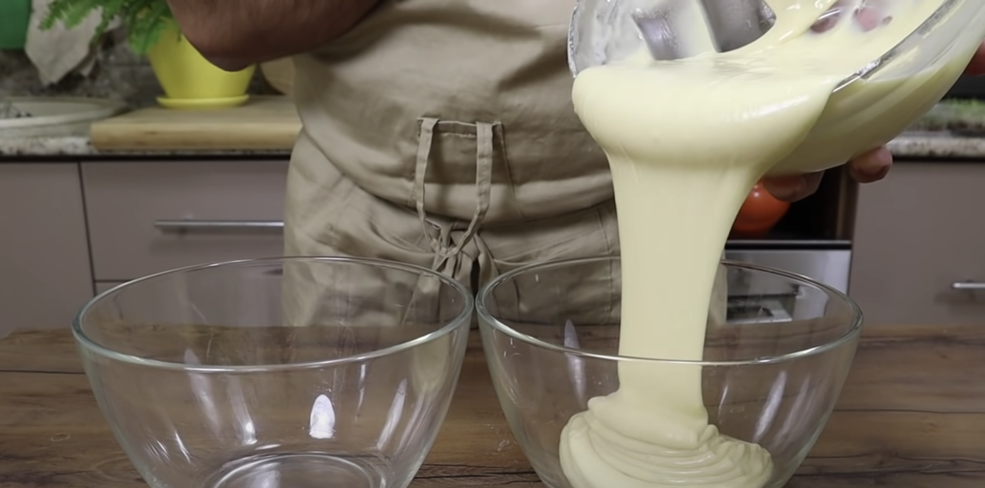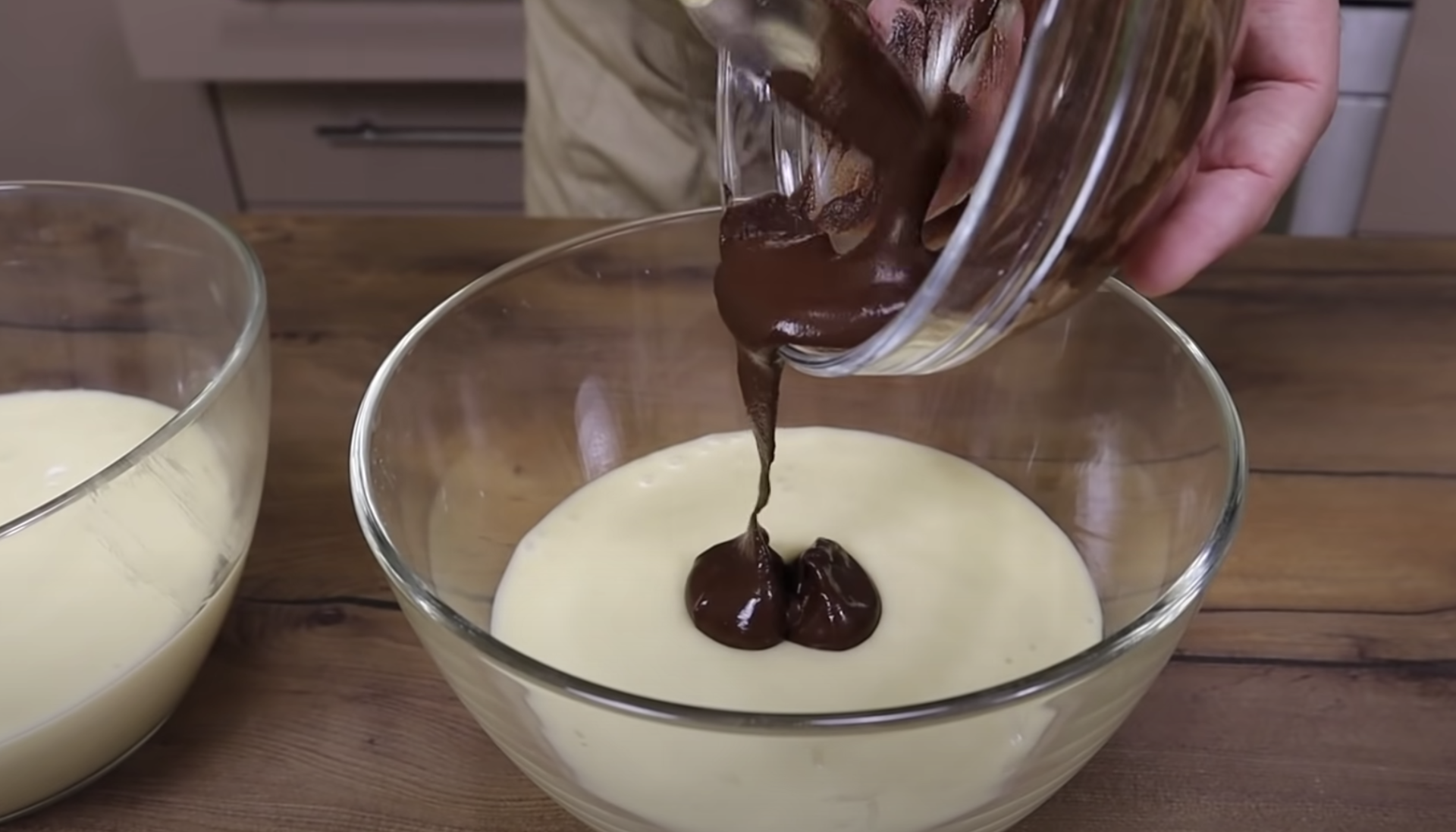 Na środku formy ustaw szklankę i wlej jednocześnie obie części ciasta.