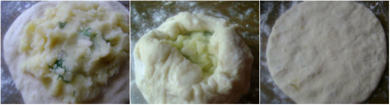 Ciasto podziel na 7-9 kawałków. Każde rozwałkuj i wypełnij farszem. Farsz może być dowolny, według uznania, zarówno w wersji mięsnej, jak i wegetariańskiej.