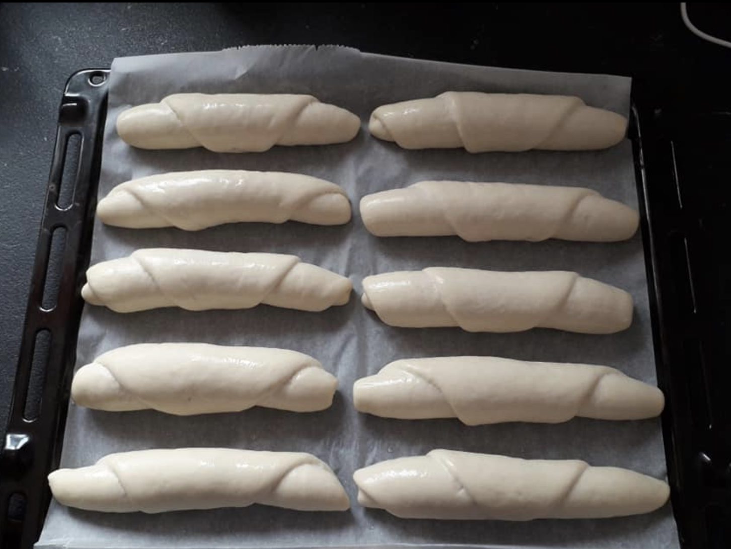 Ułóż rogaliki na papierze do pieczenia. Na 40 minut przykryj je folią. Rozgrzać piekarnik do 250°C
