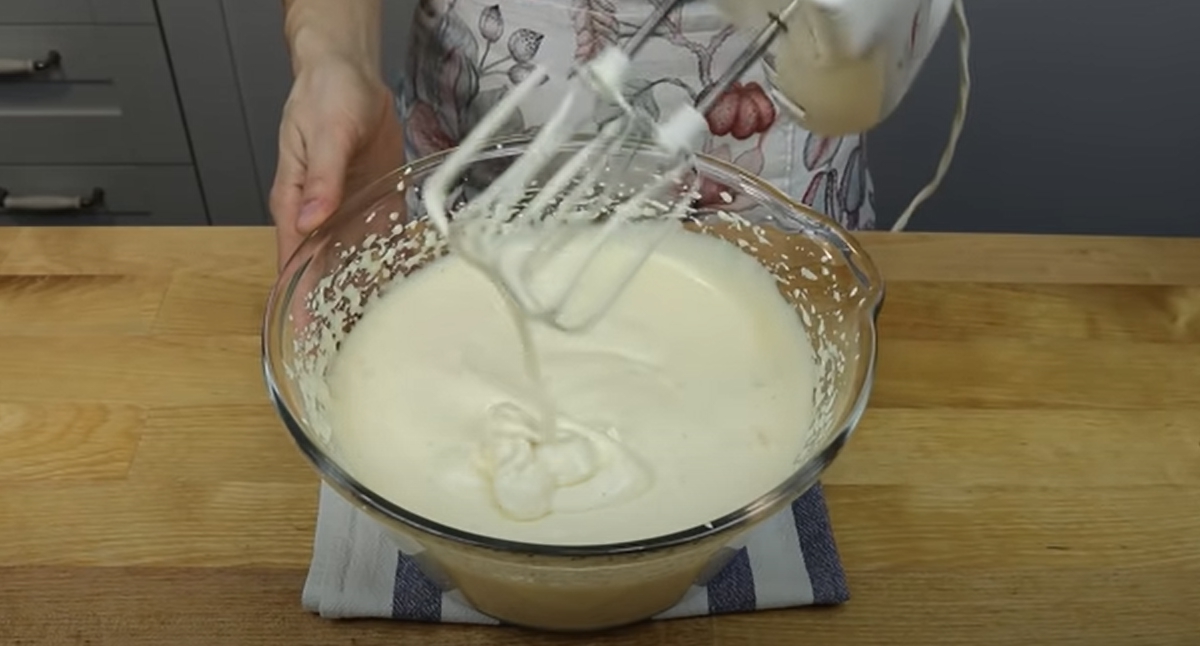 Przygotuj biszkopt. Ubijaj jajka z cukrem za pomocą miksera na wysokich obrotach przez około 10-12 minut, aż utworzy się puszysta pianka. Na koniec dodaj cukier waniliowy, sól i wymieszaj.