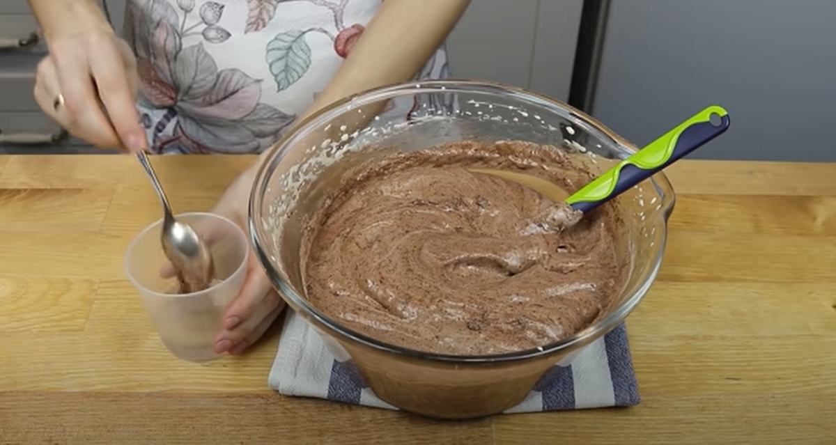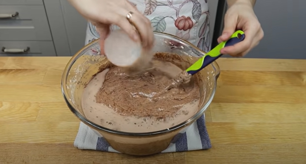 Mąkę wymieszaj z proszkiem do pieczenia i kakao, przesiej przez sito i dodawaj do miski etapami. Lekko wymieszaj od dołu do góry.