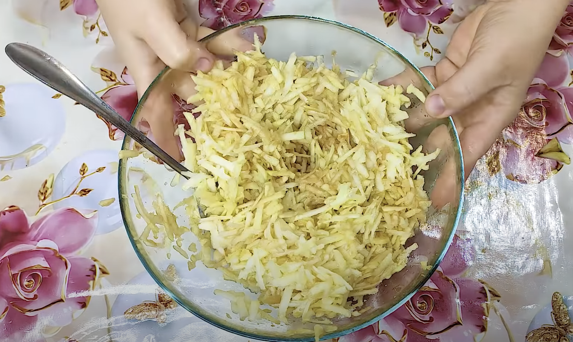 Wyłóż ją papierem lekko posmarowanym tłuszczem. Na papierze umieść starte jabłka, a na nich wyłóż ciasto i wygładź jego wierzch.