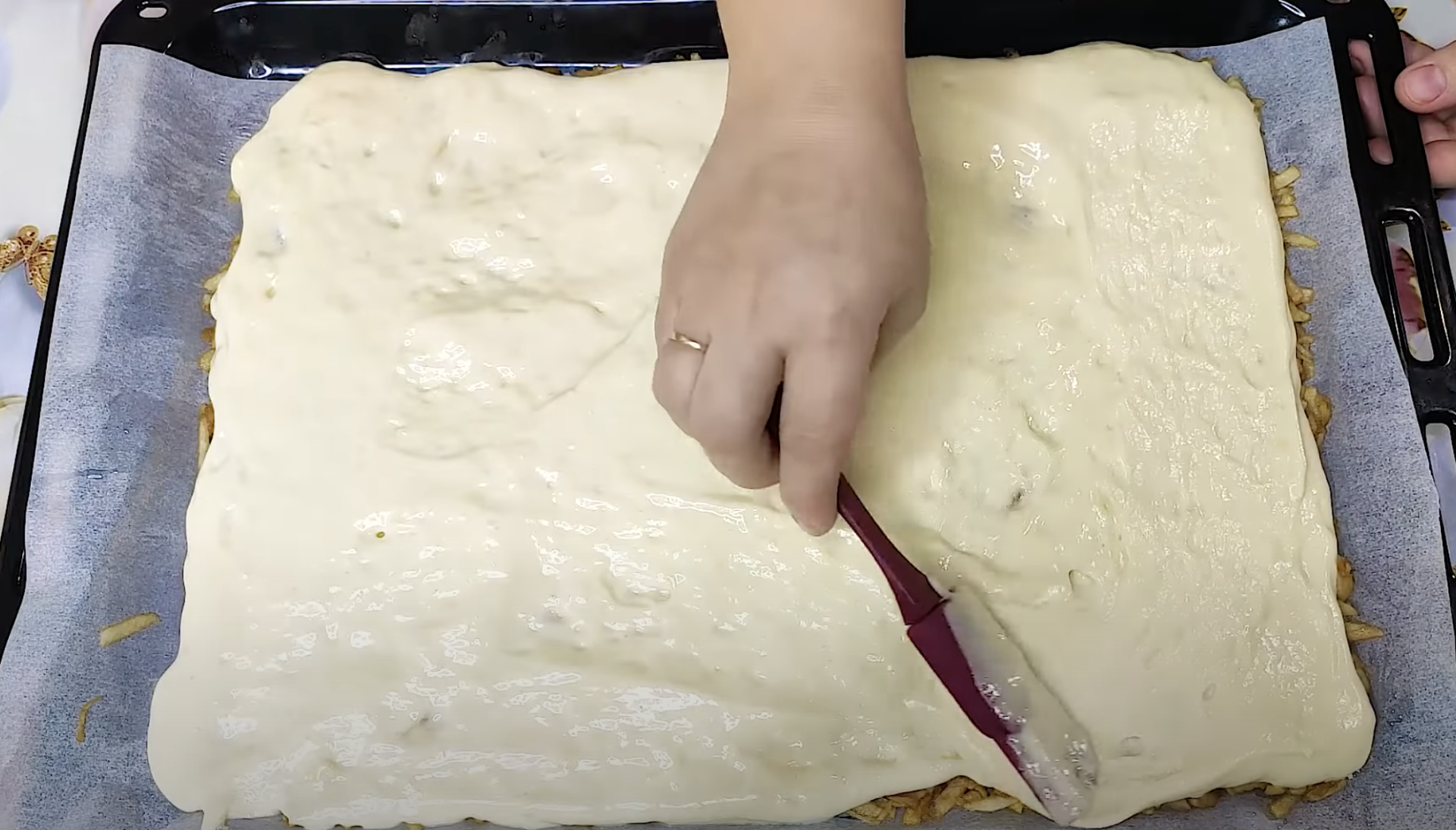 Tak przygotowaną masę piecz w piekarniku o temperaturze 180 stopni przez mniej więcej 25 minut. Następnie przykryj ciasto deską lub papierem do pieczenia i obróć wypiek blachą do góry.