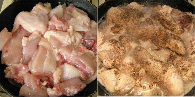 1. Na samym początku należy przygotować mięso z kurczaka. Kroimy je na średniej wielkości kawałki, a następnie umieszczamy na żeliwnej patelni lub patelni z grubym dnem.