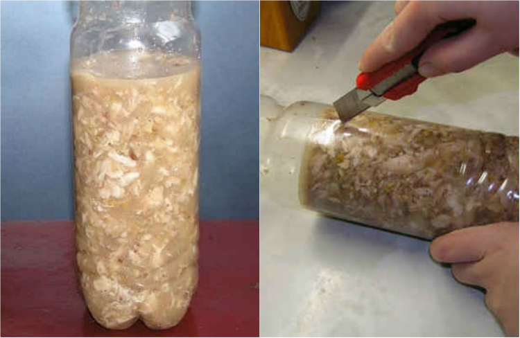 6. Bierzemy czystą plastikową butelkę i odcinamy od niej szyjkę. Napełniamy ją schłodzoną wcześniej mieszanką i wkładamy butelkę na kilka godzin do lodówki (do momentu, gdy zawartość stężeje). Po tym czasie wyjmujemy całość i przecinamy ostrożnie butelkę. Wykładamy z niej zawartość.