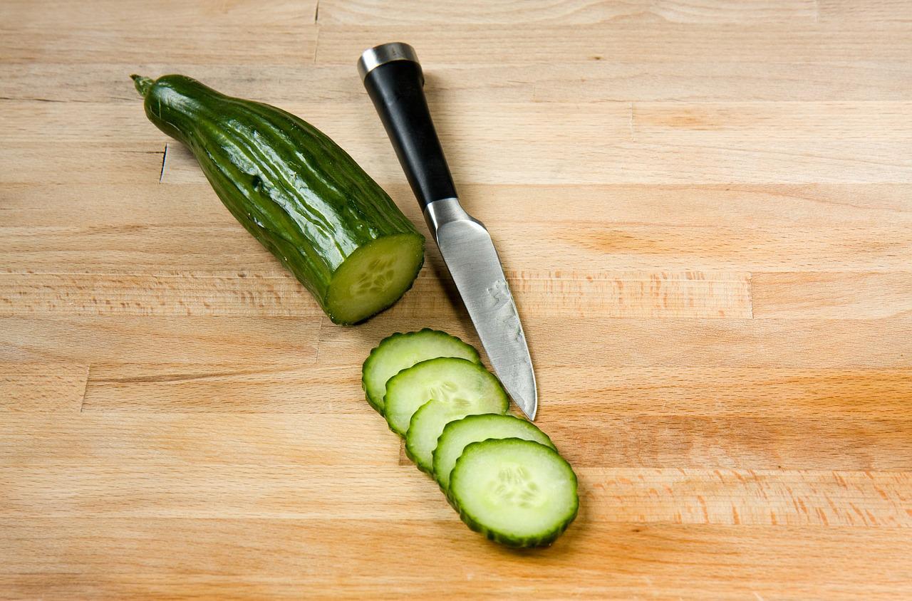 Przygotuj ogórki, krojąc je w drobne krążki. Papryki oraz cebulę drobno siekamy.