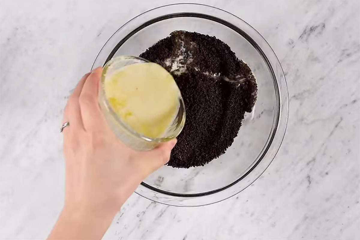 Suche ciasteczka dokładnie zmiel za pomocą blendera lub rozkrusz je młoteczkiem. Masło rozpuść i dobrze połącz z ciasteczkami.