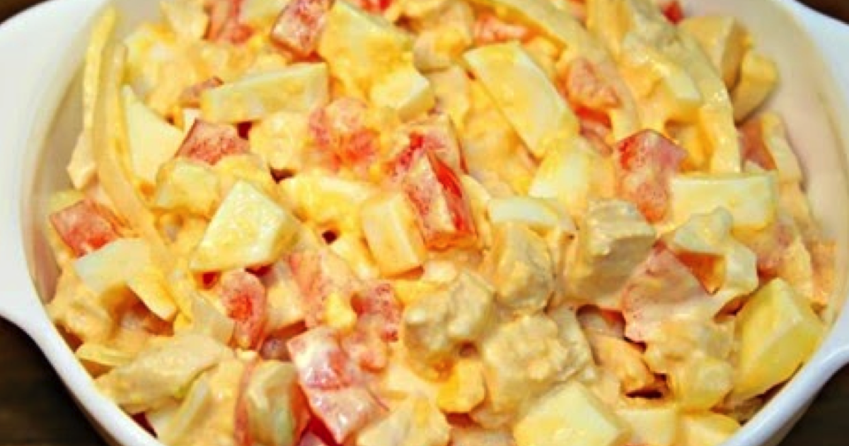 Jajka ugotuj na twardo. Pomidora pokrój w kostkę. Jajka ostudź, obierz i pokrój w kostkę. Mięso drobiowe ugotuj w podanych wyżej przyprawach. Ostudź je i pokrój na drobne kawałeczki. Wszystkie składniki wymieszaj i połącz ze sobą dodając majonez.