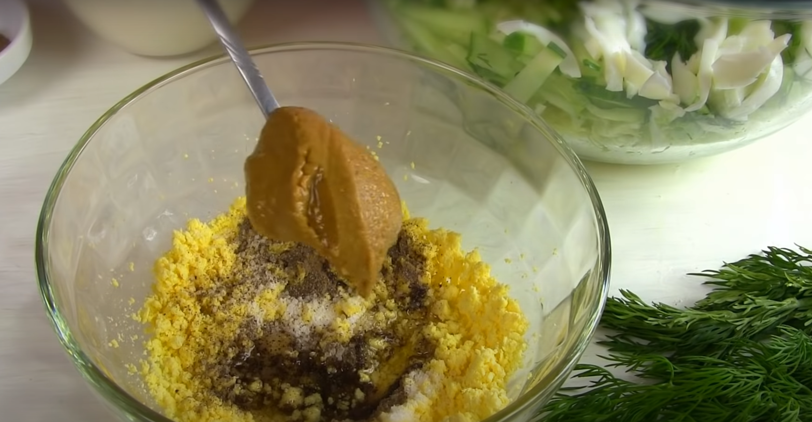 Kapustę oraz ogórka pokroić w cienkie paski. Jajka ugotować na twardo, a następnie oddzielić jajka od żółtek. Żółtka rozgnieść widelcem, białka pokroić. Żółtka wymieszać z solą, pieprzem, oliwą oraz musztardą, następnie dodać to do reszty składników i wymieszać.