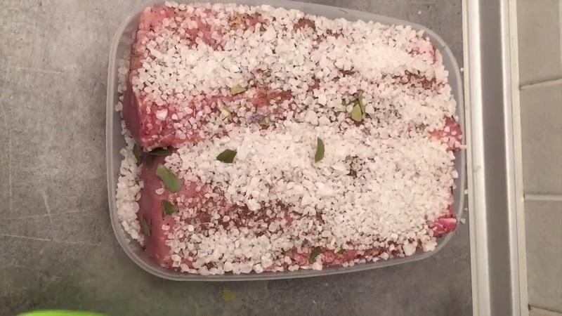 Kolejnym krokiem jest dokładne natarcie mięsa za pomocą mieszanki liści laurowych, kolendry, tymianku, rozmarynu i pieprzu. Po natarciu mięsa trzeba je włożyć do pojemnika i bardzo dokładnie przykryć solą ze wszystkich stron.