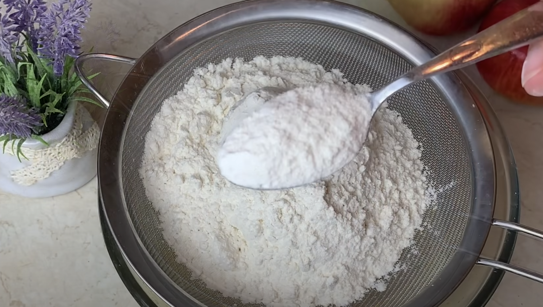 Kiedy masa uzyska jednolitą konsystencję, przesiej do niej mąkę oraz dosyp proszek do pieczenia.