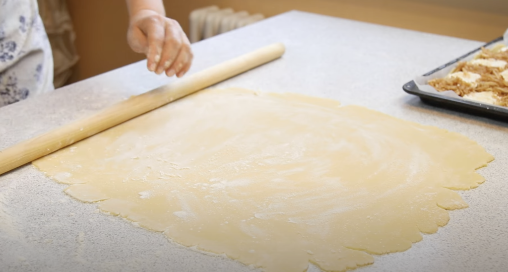 Całość przykryjesz drugą warstwą, którą rozwałkujesz w ten sam sposób, co pierwszą. Ważne jest, aby zwrócić uwagę na kawałki wystające z blachy. W razie potrzeby można je przyciąć nożem. Warto też nakłuć ciasto widelcem i posmarować je roztrzepanym jajkiem.