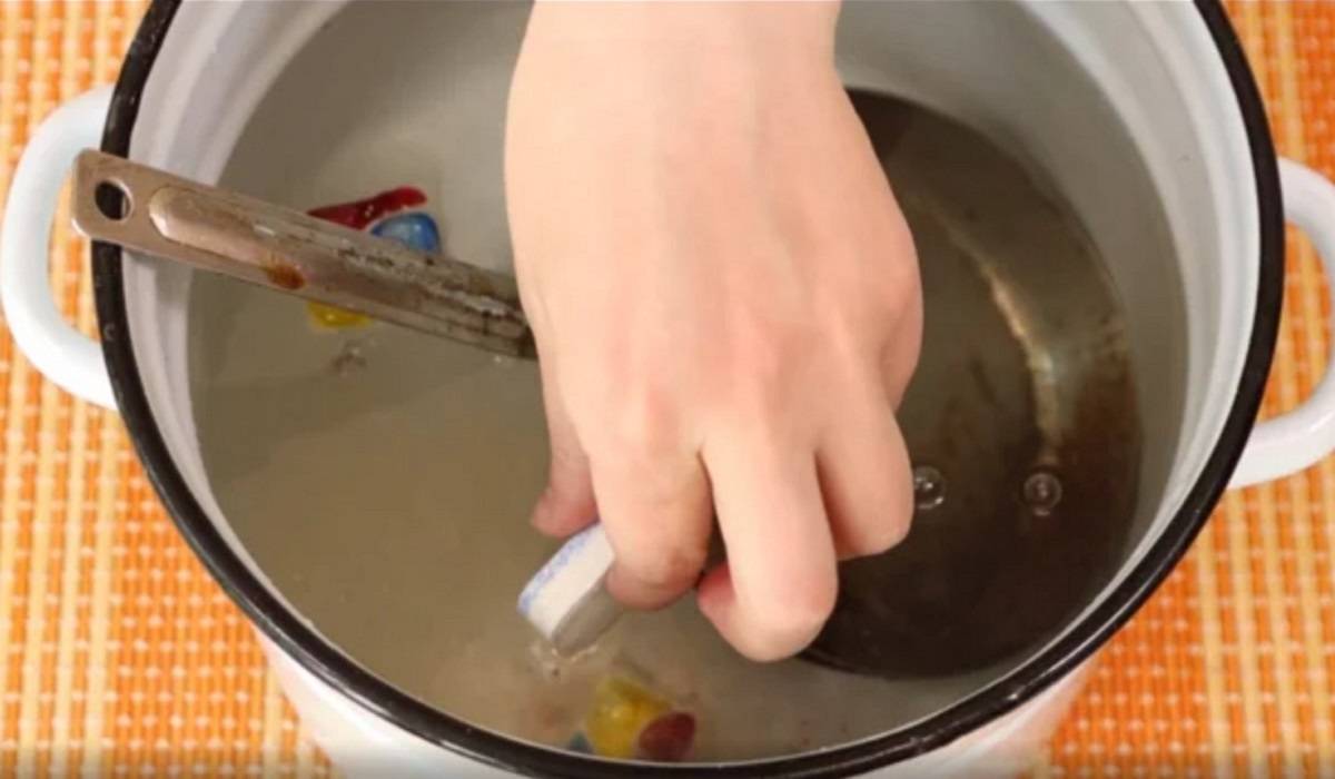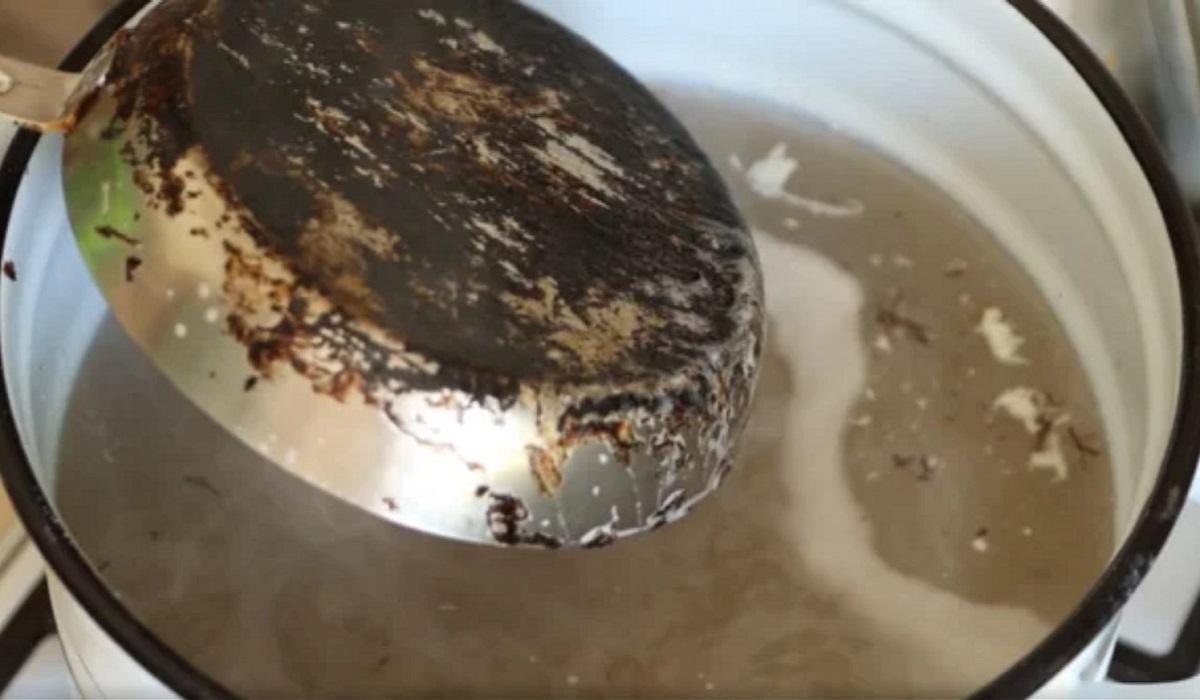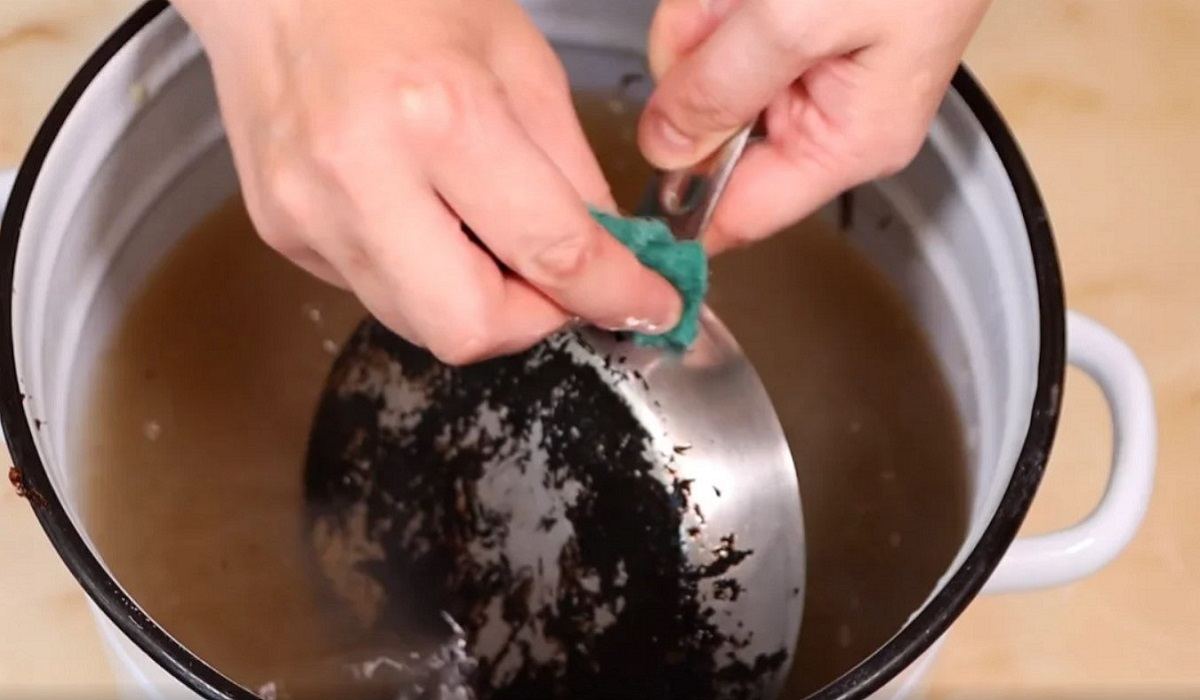 Po upływie czasu, wyjmij patelnię z wody i użyj suchej ściereczki, aby ją wyczyścić. Jeśli czarny osad pozostanie, możesz przywrócić patelnię do rondla i kontynuować gotowanie jeszcze przez kilka minut.