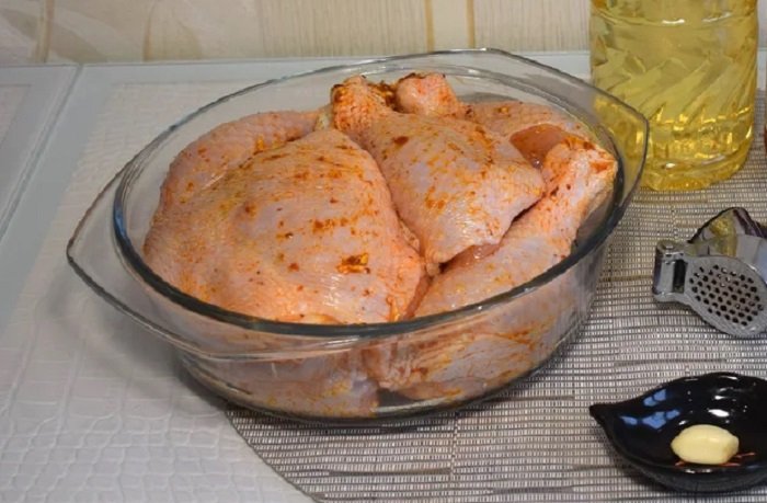 Dokładnie umyj udka z kurczaka, a w razie konieczności, odkrój nadmiar tłuszczu. Udka natrzyj przygotowanym sosem, włóż je do głębokiego naczynia, a całość umieść w lodówce na 30-40 minut.
