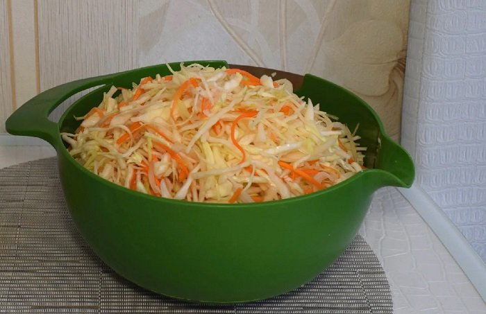Do osobnej miski wrzuć pokrojoną w półpierścienie cebulę, posiekaną kapustę oraz startą na tarce marchewkę. Całość dopraw szczyptą soli i łyżką oleju słonecznikowego, a następnie dokładnie wymieszaj.