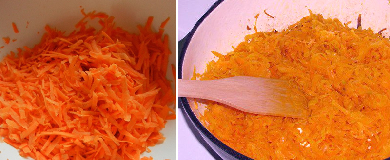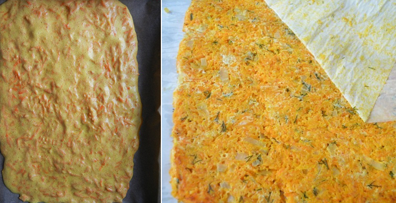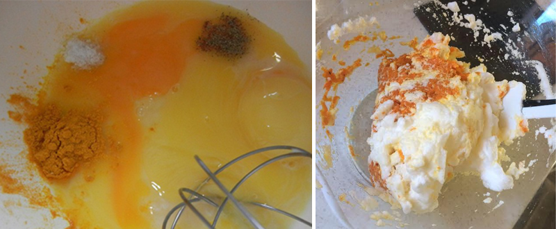 Oddzielić żółtka od białek. Żółtka wymieszać z solą kurkumą i przyprawami oraz dodać schłodzoną marchewkę. W osobnym naczyniu ubić białko na sztywna pianę z dodatkiem soli i soku z cytryny. Teraz należy połączyć ciasto z białkami delikatnie mieszając szpatułką.