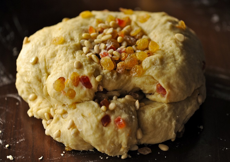Dodaj kandyzowane owoce, rodzynki i orzechy, wymieszaj. Pozostaw ciasto na 1,5 godziny w ciepłym miejscu, aż objętość ciasta powiększy się co najmniej dwukrotnie.