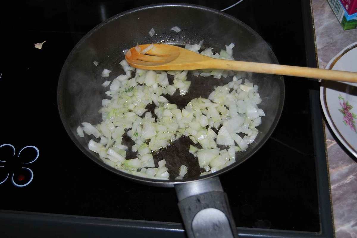 Podczas gdy ciasto rośnie, przychodzi czas na przygotowanie farszu. W pierwszej kolejności należy posiekać drobno cebulę oraz podgrzać ją na maśle.