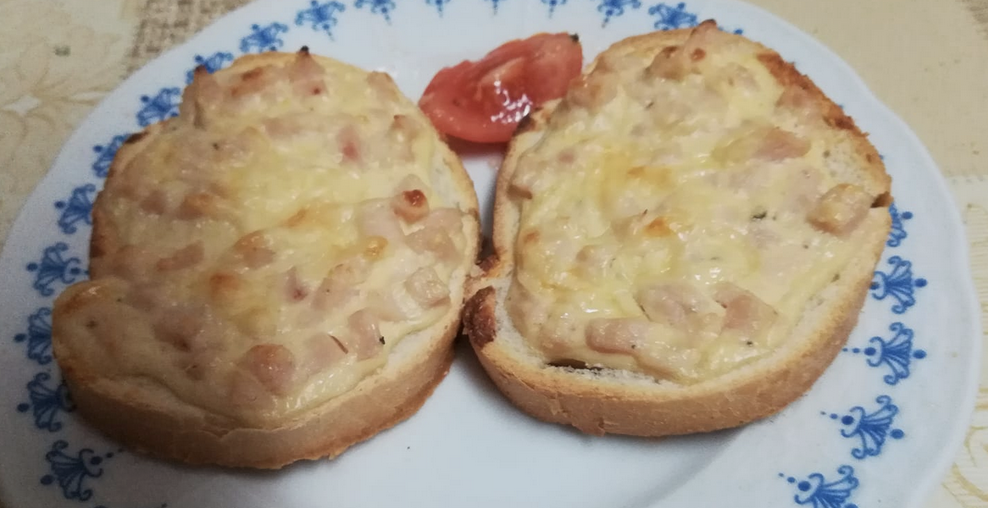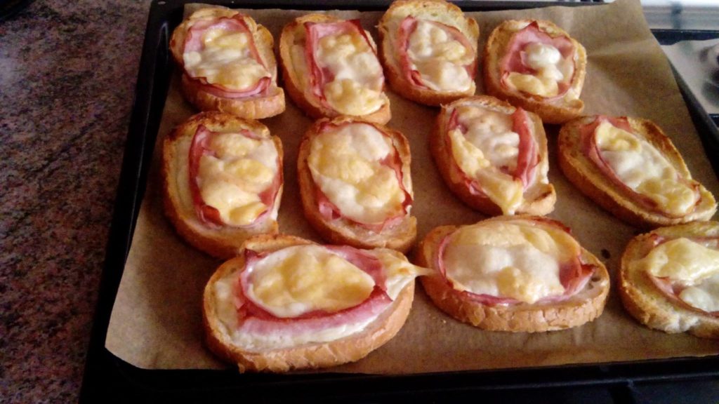 Żółty ser ścieramy na tarce o grubych oczkach i łączymy z jajkami oraz drobno pokrojoną szynką. Dodajemy przeciśnięty przez praskę czosnek. Tutaj można, lecz nie trzeba, dodać śmietanę. Kromki chleba smarujemy masłem i układamy na blasze przykrytej papierem do pieczenia. Na każdej z nich układamy cienką warstwę przygotowanej masy. Całość wstawiamy do nagrzanego piekarnika i pieczemy przez około 15-20 minut. I to wszystko.