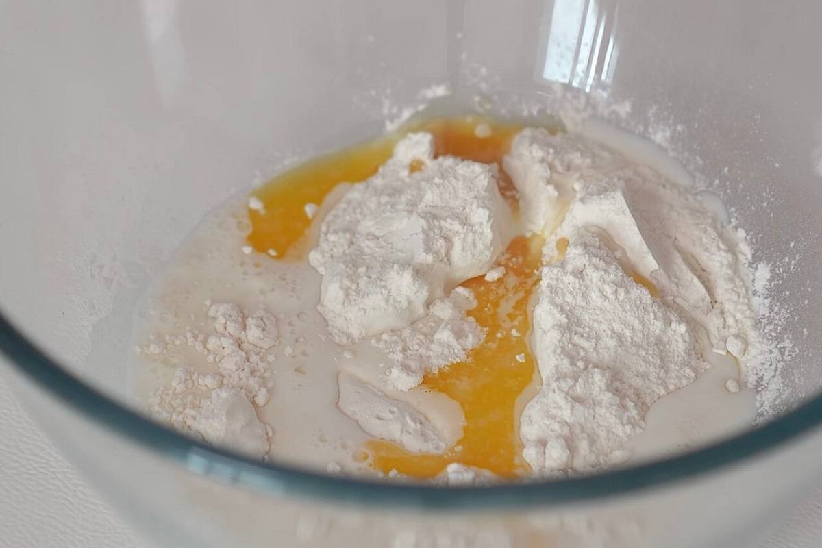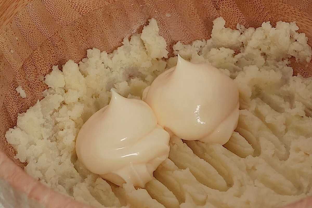 Wymieszaj majonez za pomocą tarki do ziemniaków. Po godzinie wyjmij ciasto z lodówki i zwiń je w rulon.