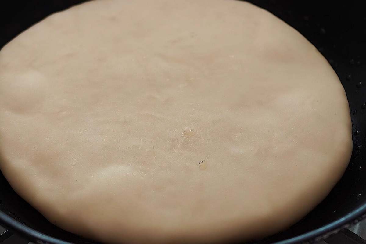 Połóż naleśnik na oleju na dużej patelni. Odwróć go i smaż na złoty kolor.
