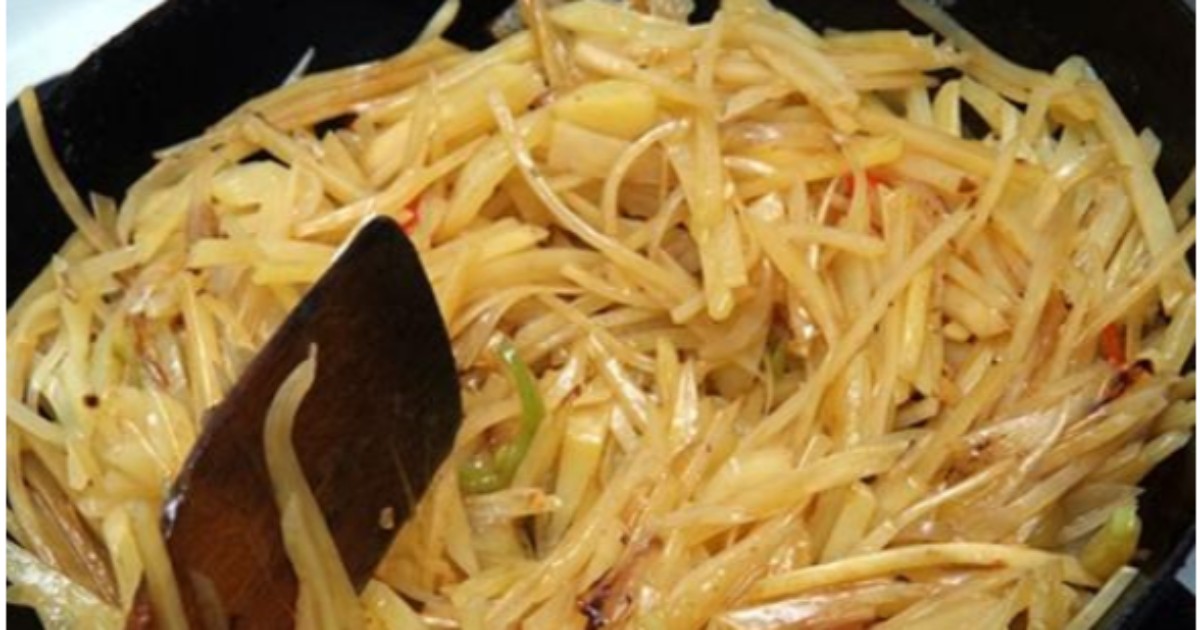 W pierwszej kolejności należy przygotować wszystkiego składniki, ponieważ trzeba je dodać praktycznie w tym samym czasie. Paprykę posiekać w paski, marchew i ziemniaki zetrzeć na długie i cienkie paski na specjalnej tarce (jak w przepisie na koreańską marchew), cebulę pokroić w pierścienie. Rozgrzać olej na patelni.