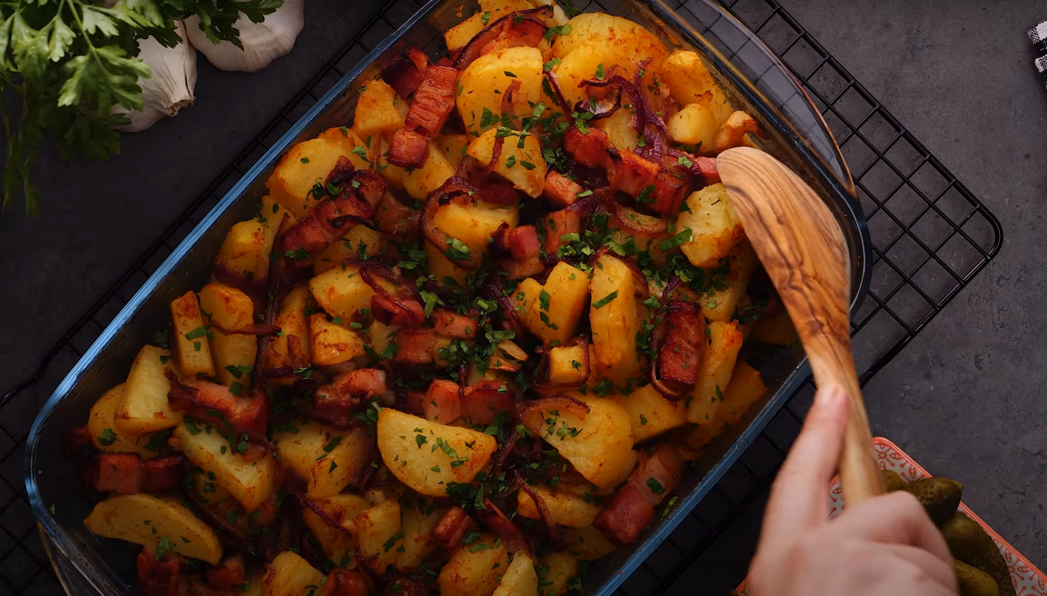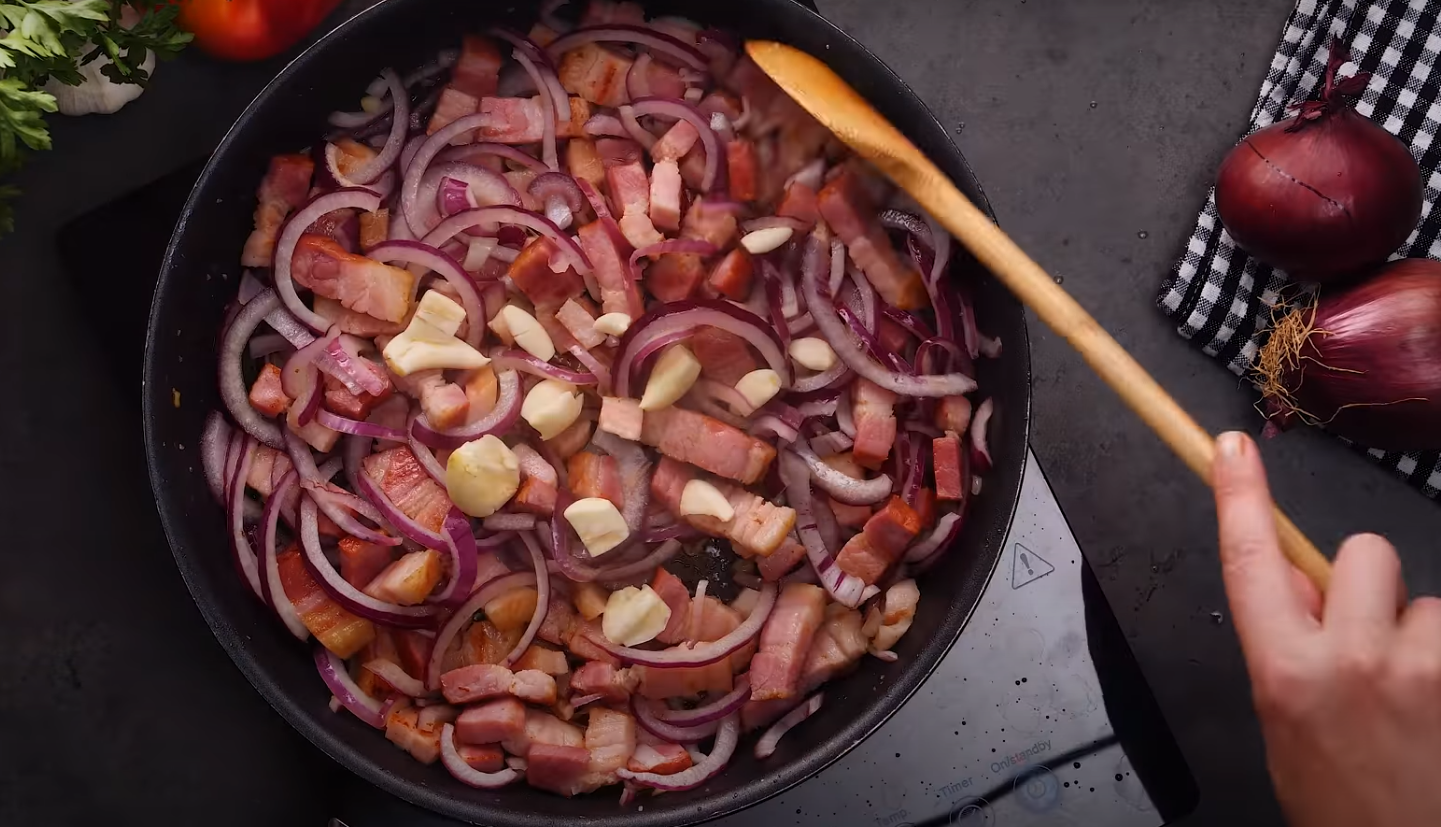 W między czasie posiekaj boczek i podsmaż na patelni. Boczek sam z siebie jest wystarczająco tłusty, dlatego nie ma potrzeby używania oleju czy też masła. Następnie pokrój cebulę w półpierścienie i dodaj ją do smażącego się boczku. Na sam koniec należy dorzucić także posiekany czosnek.