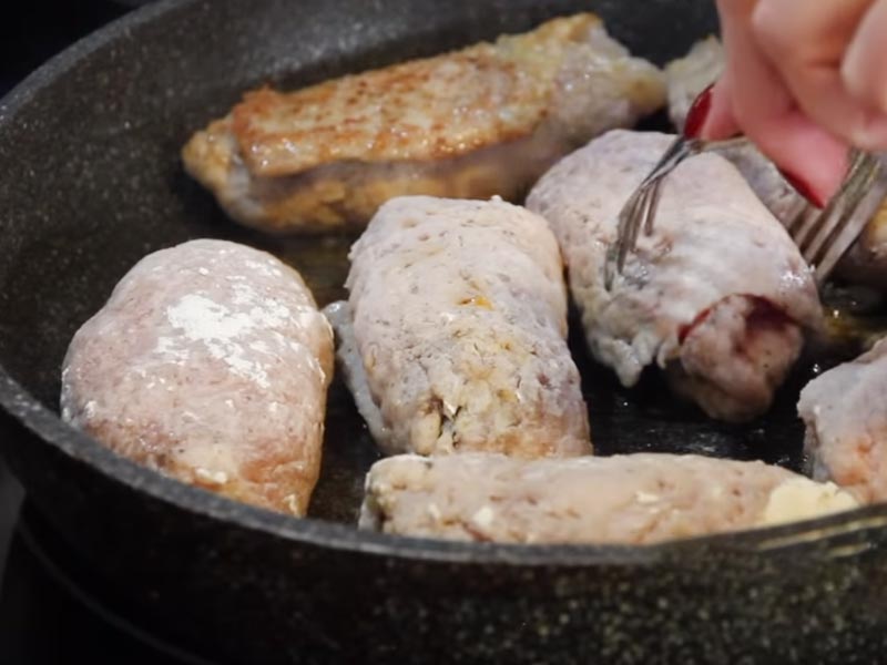 W tej mieszance marynować cebulę przez 10 minut. Następnie wyjmij oba składniki z naczyń. Na każdy kawałek mięsa położyć odrobinę cebuli i zwinąć. W mące obtoczyć kawałki mięsa i smażyć na złoty kolor na rozgrzanej patelni.