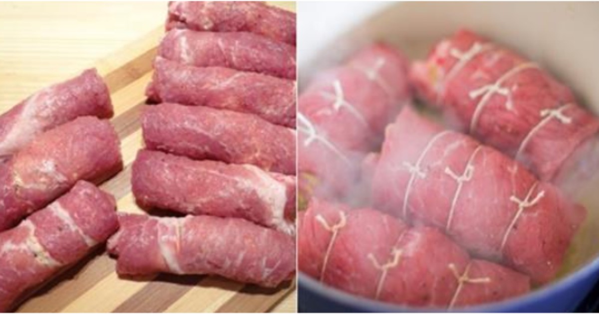 Mięso trzeba zwinąć w roladkę i związać nitką, aby podczas pieczenia roladka się nie rozpadła. Powstałe roladki smażymy na oleju na złoty kolor, a następnie wkładamy do naczynia żaroodpornego i pieczemy w rozgrzanym do 180°C piekarniku przez 12 minut.